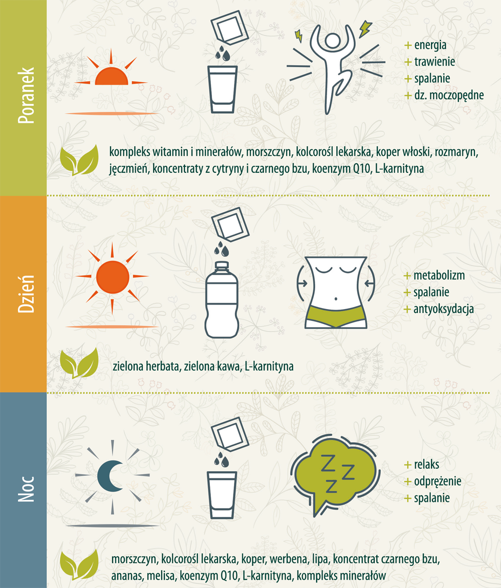 - W porcji wieczornej można znaleźć natomiast ekstrakty wyciszające, relaksujące i tonizujące. Produkt wspomaga lipolizę.